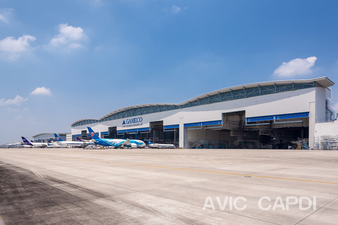 Размер ангара: (100м+150м+100м) × 95м × 29м (длина пролета, глубина, высота нижнего пояса) Способность ремонта: Капитальный ремонт, лакирование Строительная площадь: 113000кв.м Земельный участок: 59500кв.м Дата завершения: 2004г. Особенность данного объекта: 3 ремонтные места для капитального ремонта В747, 1 место для лакирования В747. И возможно выполнять ремонт для А380. Первый раз принимают подъемную вороту в Китае. Знаменитое сооружение в новом аэропорту Байюнь Гуанчжоу. |