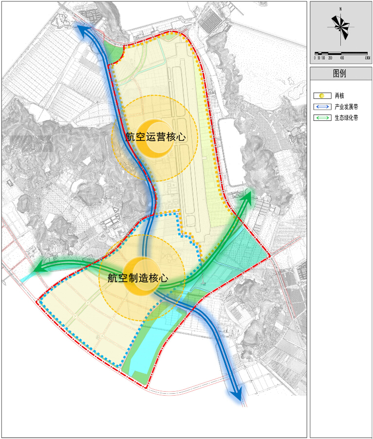總體布局:該片區(qū)總體上形成“兩核兩帶”的規(guī)劃結(jié)構(gòu)。兩核為航空運(yùn)營核心和航空制造核心,兩帶為產(chǎn)業(yè)發(fā)展帶和生態(tài)綠帶。